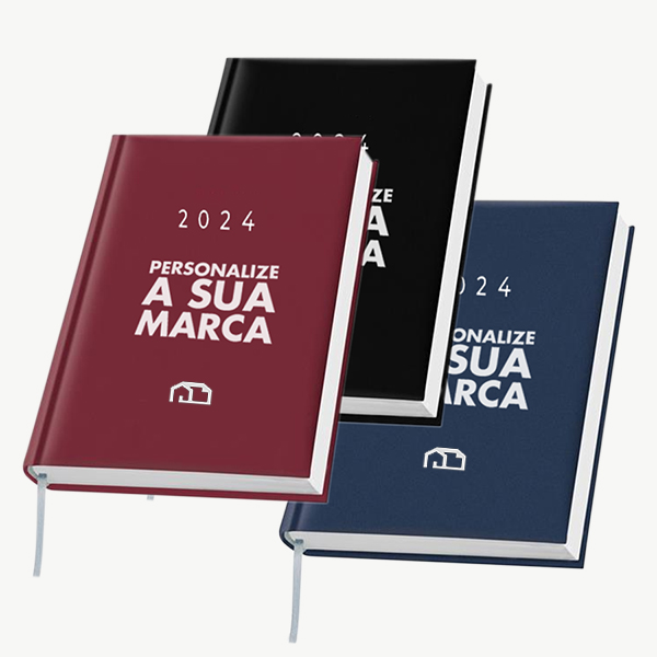 Agenda A5 com capa rígida, impressão UV frente 12x12cm, idioma principal Português e Espanhol. No interior inclui espaço para preenchimento de dados pessoais, calendários 2022, 2023 e 2024, feriados em lista, plano de férias, plano diário 2023, plano diário 2024 e espaço para preenchimento de contactos importantes (de A-Z).