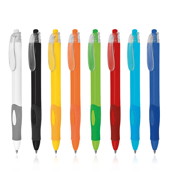 - Esferográfica com pega e corpo coloridos e clip transparente.